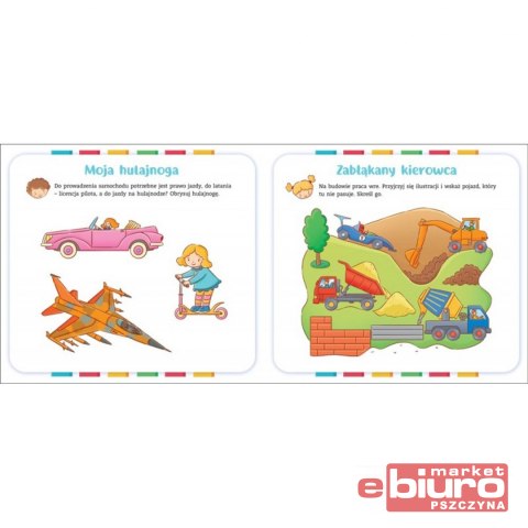Bawiąc się tą książeczką, dziecko wzbogaci swoją wiedzę o pojazdach, a dodatkowo rozwiąże wiele ciekawych zadań: połączy w pary pasujące obrazki, narysuje po liniach przerywanych, policzy elementy.