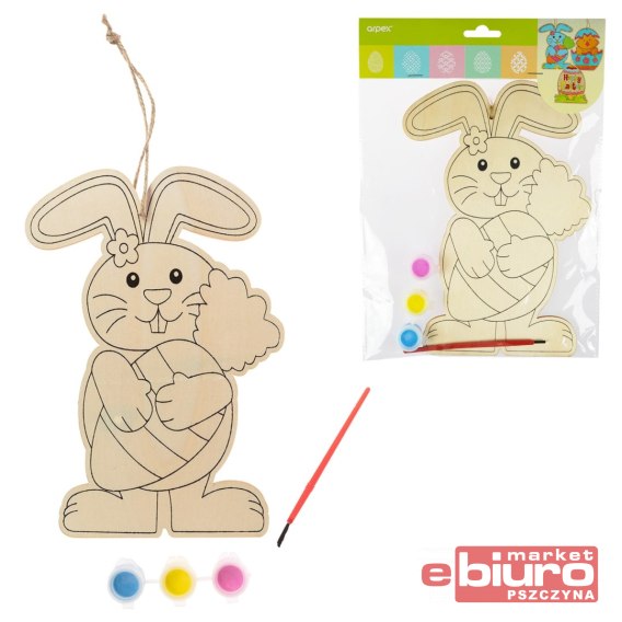 Zestaw kreatywny w formie drewnianej zawieszki w kształcie króliczka wielkanocnego z marchewka, przeznaczony do własnoręcznego dekorowania.