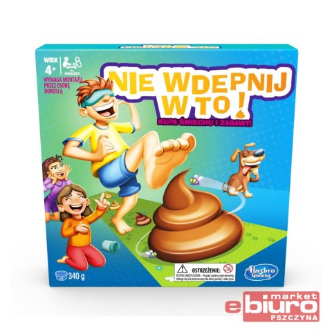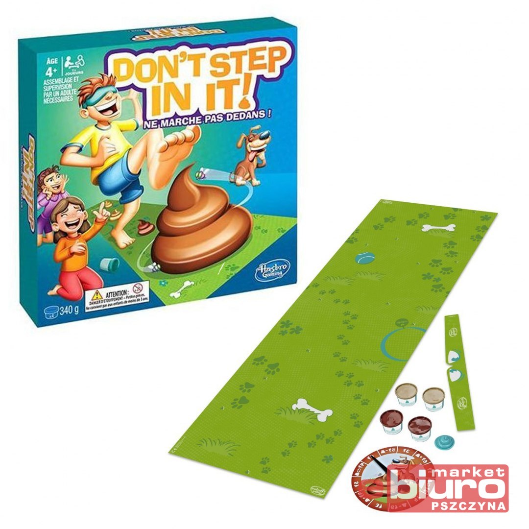 Gra Nie wdepnij w to Wersja Polska E2489. W tej grze ważny jest każdy krok! Nałóż opaskę, zakręć spinnerem, a następnie wykonaj odpowiednią ilość kroków na macie do gry. Pamiętaj jednak, aby uważać! Na macie w strategiczny sposób, rozstawiona została ciastolina w kształcie psiej kupy. Nie chcesz chyba w nią wdepnąć?! Czy uda ci się dojść do końca maty, zupełnie czystym? Wdepnij w jak najmniej kup, aby wygrać! W zestawie 4 tubki ciastoliny, jedna przepaska, foremka do psiej kupy, spinner oraz mata do gry. Gra od 4 roku życia. Aby posprzątać po zabawie, pozwól ciastolinie wyschnąć, wówczas ją zdrap i odkurz. Uformowane kształty mogą się różnić.