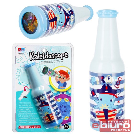 Zalety produktu: pobudza wyobraźnię dziecka, występuje w czterech wzorach i kolorach, kalejdoskop w kształcie butelki z napojem.
