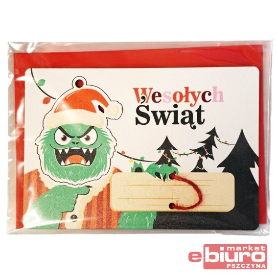 Drewniana karnet z kolorowym nadrukiem na Święta Bożego Narodzenia.