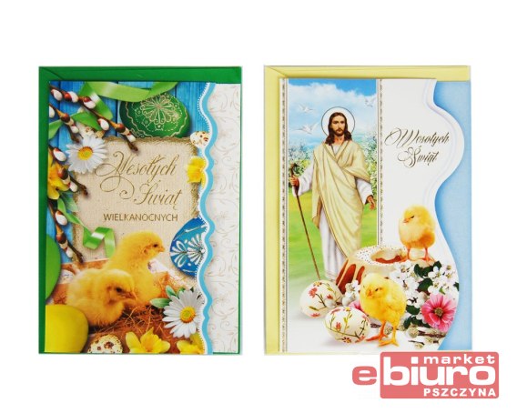 Karnet kartka wielkanocna. Każda kartka w środku ma wypisane życzenia. Dodatkowo do każdego karnetu dołączona jest koperta. Dostępne różne rodzaje. Kartki wysyłane w miarę dostępności losowo.