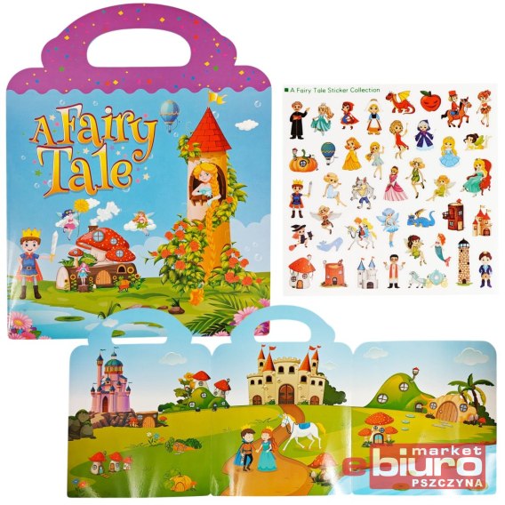 Książeczka z naklejkami różnych postaci oraz akcesoriów występujących w bajkach, do wyklejenia w środku.