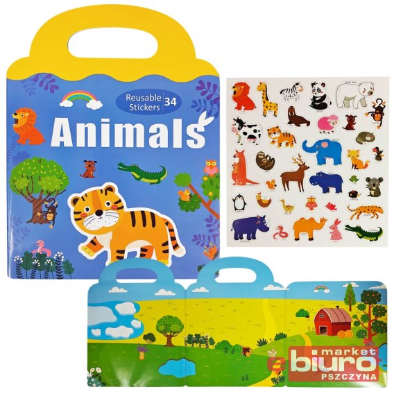 Książeczka z 34 naklejkami dzikich zwierząt, do wypełnienia w środku.