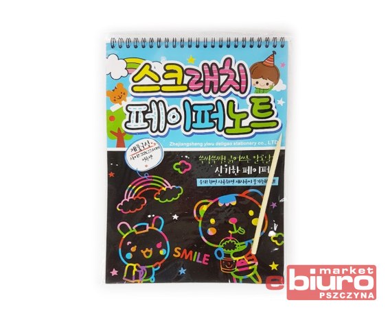 Zabawa polega na zdrapaniu wierzchniej czarnej warstwy, aby powstał ciekawy obrazek. Pod czarną warstwą podkładka ma kolorowe, tęczowe tło. Rezultat pracy nie jest do końca znany, gdyż zależy od ułożenia kolorów ukrytych pod czarną warstwą.