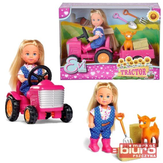 Laleczka Evi, ubrana w tematyczny strój farmerki, ma 12 cm wysokości i jest wyposażona w różne akcesoria, w tym traktor z przyczepą.