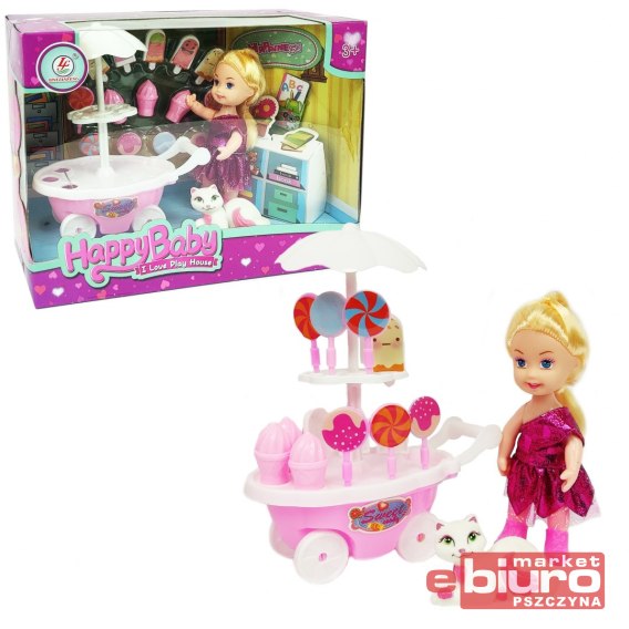 W zestawie laleczka z kotkiem, kilka rodzajów lodów (w wafelku, na patyku) i lizaków.
