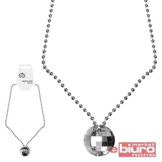 Plastikowa kula dyskotekowa w kolorze srebrnym, mocowana na srebrnym sznureczku.