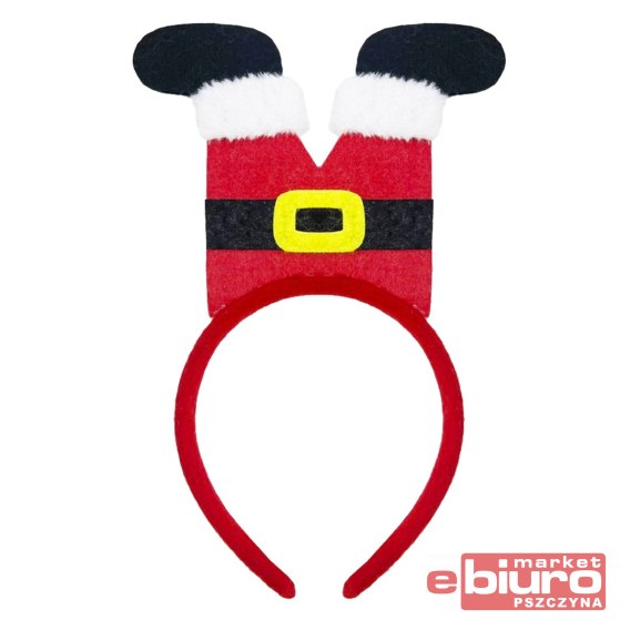 Opaska „Nogi Mikołaja" to humorystyczny dodatek świąteczny, który przedstawia czerwone nogi Świętego Mikołaja z czarnymi butami i złotą klamrą, wystające do góry niczym z komina.