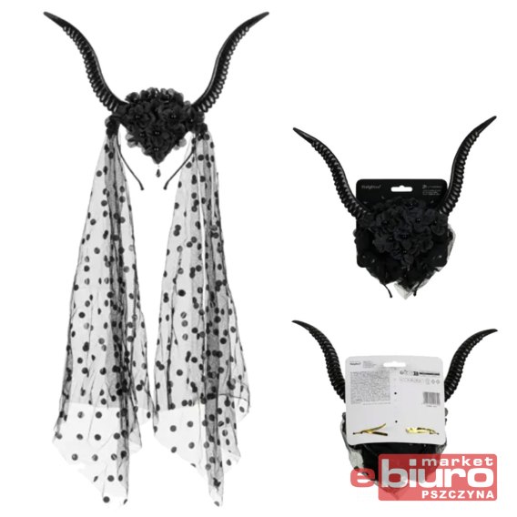 U podstawy rogów, centralnie na opasce, znajduje się ozdobny element z czarnymi kwiatkami i drobnymi koralikami, a także opadający czarny welon z tiulu, ozdobiony kropkami.