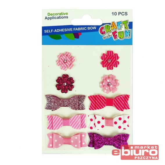 Zawartość opakowania: 10 x materiałowe samoprzylepne ozdoby: 6 x kokardka, 4 x kwiat.