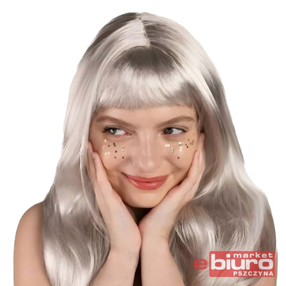 Sztuczne włosy są długie, proste i mają srebrny kolor oraz grzywkę.