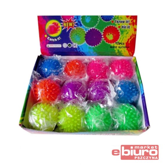 Mała gumowa piłeczka z kolcami świecąca kolorowymi światełkami.