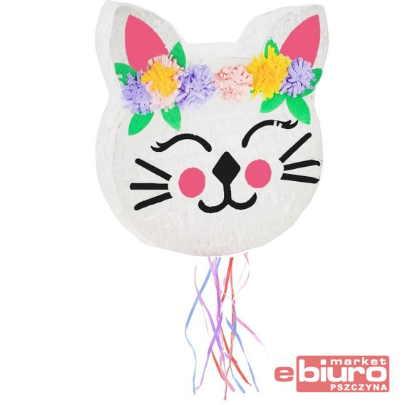 Piniata w kształcie głowy kotka do wypełnienia upominkami, drobiazgami lub cukierkami.