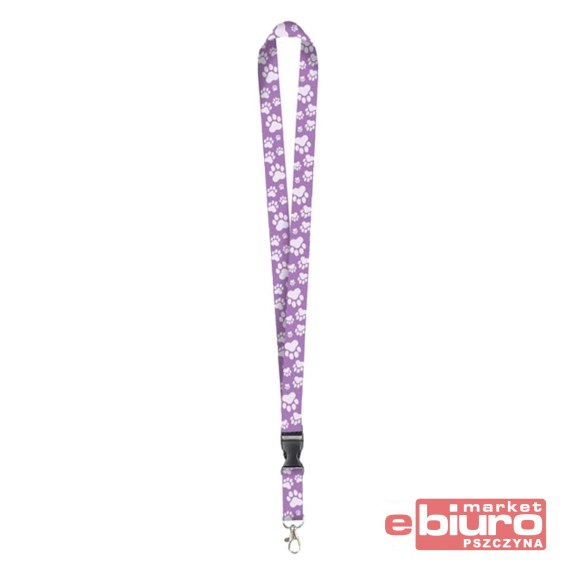 Miękki, fioletowy wzór z białymi odciskami łap nadaje brelokowi wesoły i przyjazny wygląd.