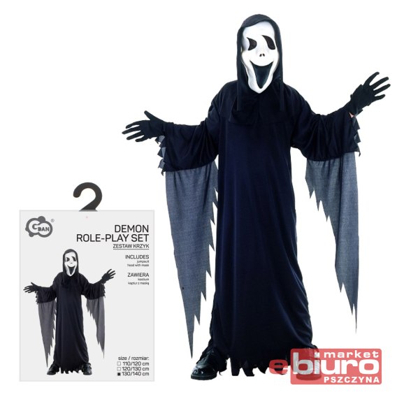 Kaptur oraz maska dopełniają całości, tworząc przerażający efekt, który z pewnością zachwyci wszystkie dzieci pragnące się wyróżnić na imprezie.