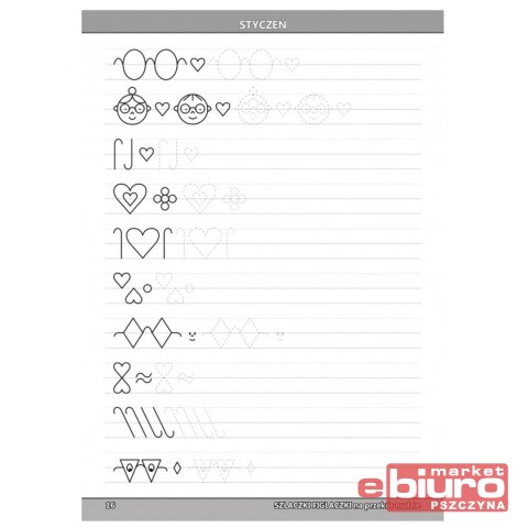 Zadaniem ucznia jest przyjrzenie się wzorowi, poprawienie go po śladzie, następnie po linii przerywanej, a w końcu samodzielne jego odtworzenie.