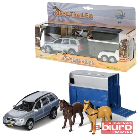Zawartość zestawu: samochód metalowy, przyczepa dla koni, 2 figurki koni.