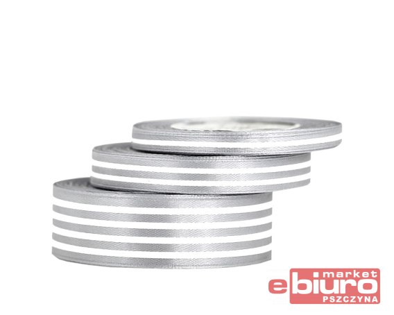 Wstążka satynowa w białe paskiWymiary: 25mm x 32m.Kolor: srebna.Idealna do różnego rodzaju dekoracji.