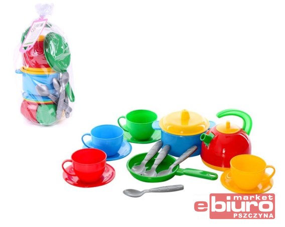 Zestaw zabawek Martynka. Opakowanie zawiera wszystko, co może zainspirować przyszłą kochankę lub szefa kuchni do kulinarnych wyczynów. Zestaw wykonany jest z wysokiej jakości tworzywa sztucznego, dzięki czemu można go używać np. w piaskownicy. Zestaw zawiera naczynia i sztućce w pastelowych kolorach: 4 kubki, 4 talerzyki, 4 łyżki stołowe, patelnię, garnek, czajnik.Rozmiar produktu: 23x11x11 cmRozmiar opakowania: 39 x 39 x 29 cm.