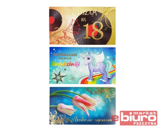 Zaproszenia na urodziny i inne okazje. Do zaproszeń dołączona koperta. Dostępne różne rodzaje. Kartki wysyłane w miarę dostępności losowo. Opakowanie zawiera 10 sztuk zaproszeń i kopert.