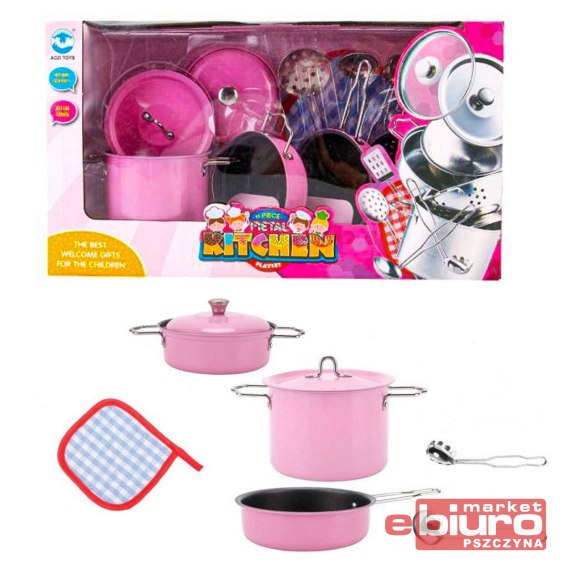 Komplet metalowych garnków składa się z 11 elementów. Wykonane w delikatnym, różowym kolorze zachwycą każdą dziewczynkę.W komplecie znajdują się 2 garnki, 2 pokrywki, patelnia, durszlak, 4 łyżki kuchenne i ściereczka.Zabawki wykonane są z trwałych, wytrzymałych materiałów.Produkt nieodpowiedni dla dzieci poniżej 3 lat.Wymiary opakowania: 30,5x10,5x21,5 cm.