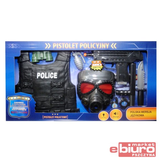 Zabawka z dźwiękami syreny policyjnej, strzelania, przeładowania broni oraz komendami policyjnymi w języku polskim: "Do wszystkich jednostek: Zgłaszam napad, ruszajmy do akcji", "Policja! Ręce do góry", "Stój, bo będę strzelał", "poddaj się, rzuć broń! Jesteś otoczony", "Jesteś aresztowany, jedziemy na komendę". W zestawie poza pistoletem znaleźć można także maskę, kamizelkę, lornetkę, nóż, kompas, gwizdek.Produkt działa na baterie typu AG10. Baterie znajdują się w zabawce.Zabawka idealna na prezent z każdej okazji.Zabawka zapakowana w kartonowe opakowanie z okienkiem.Produkt nieodpowiedni dla dzieci poniżej 3 lat.