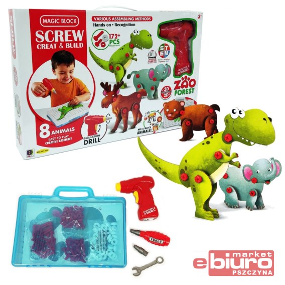 Zestaw do układania zwierząt za pomocą planszy i śrub a wszystko można układać na plastikowej walizce.